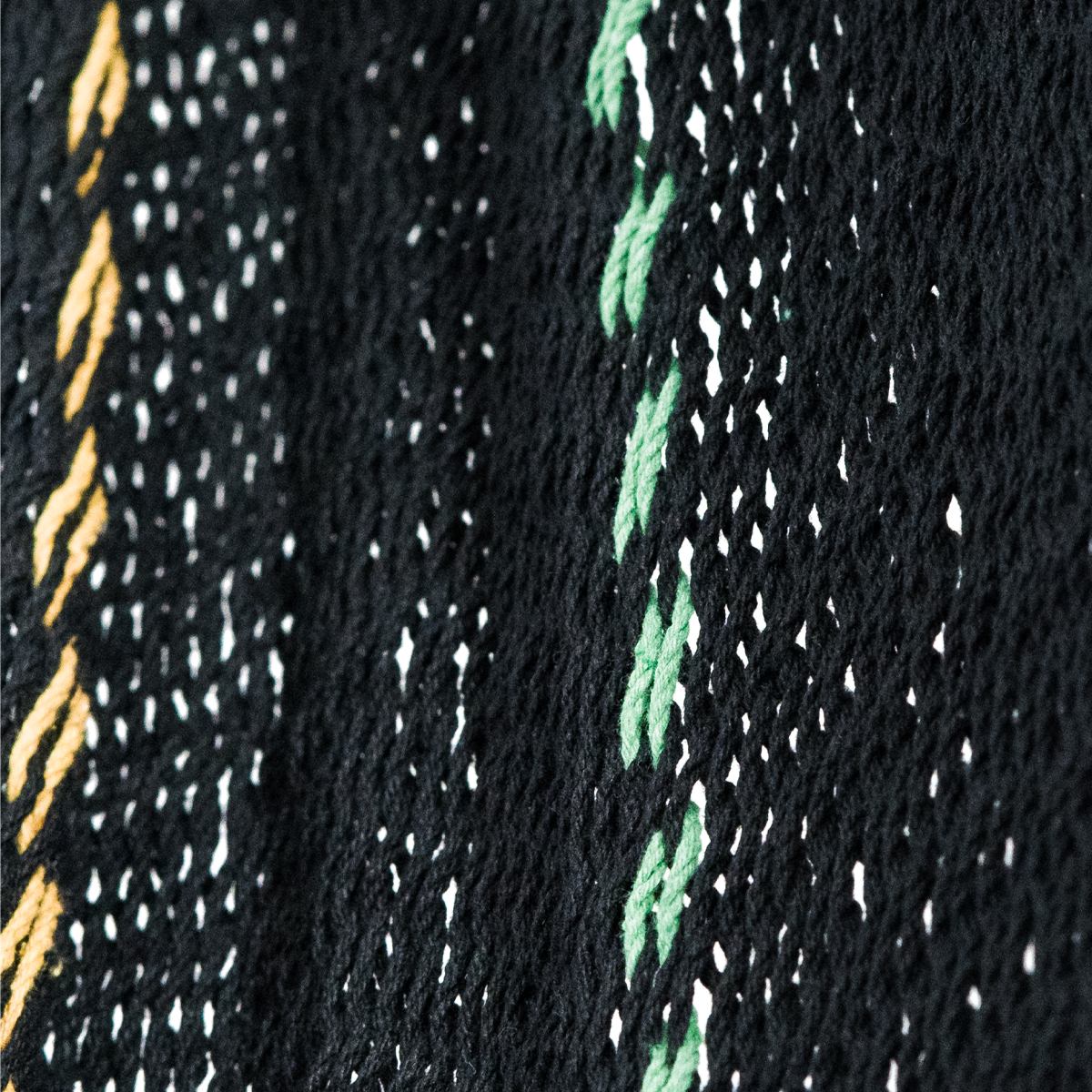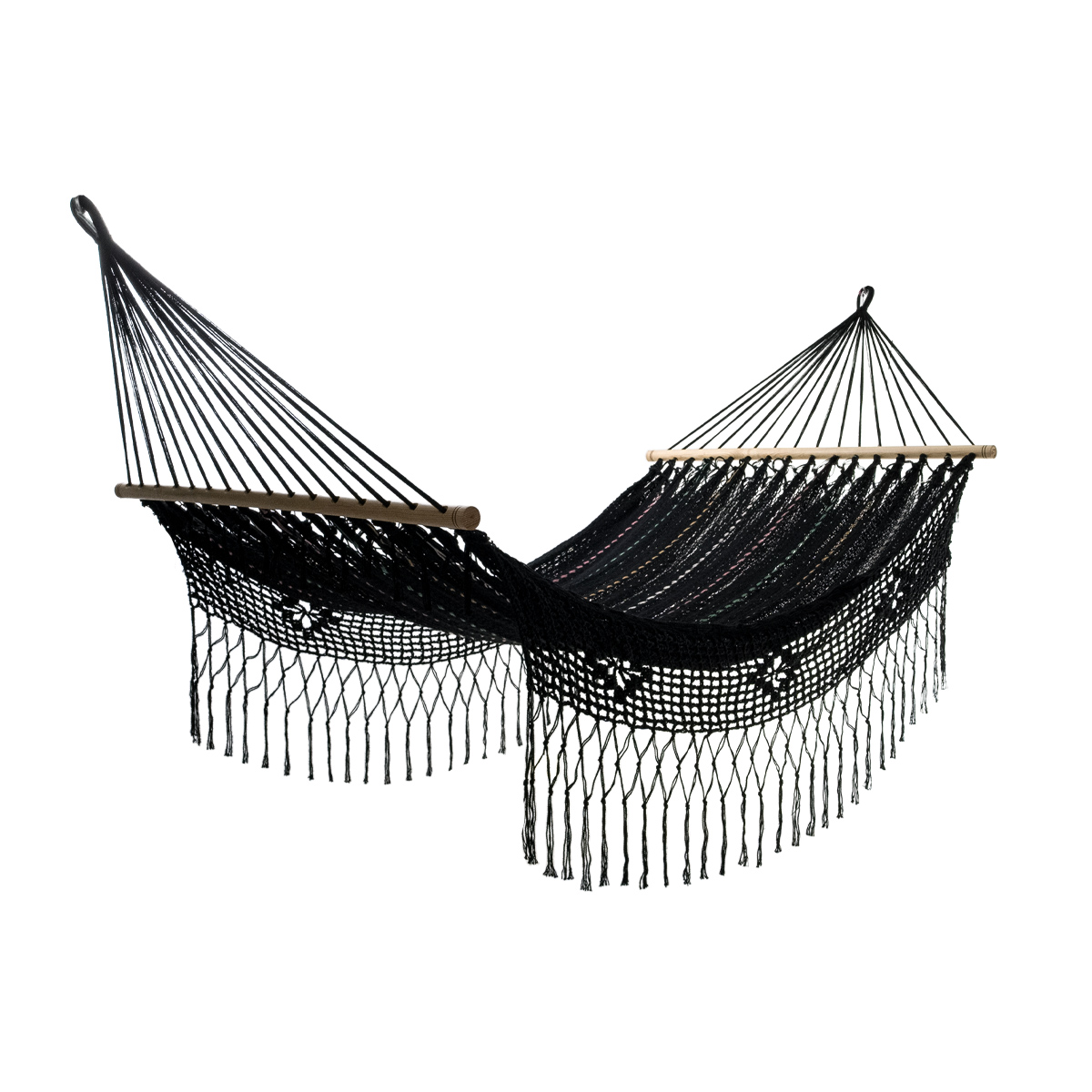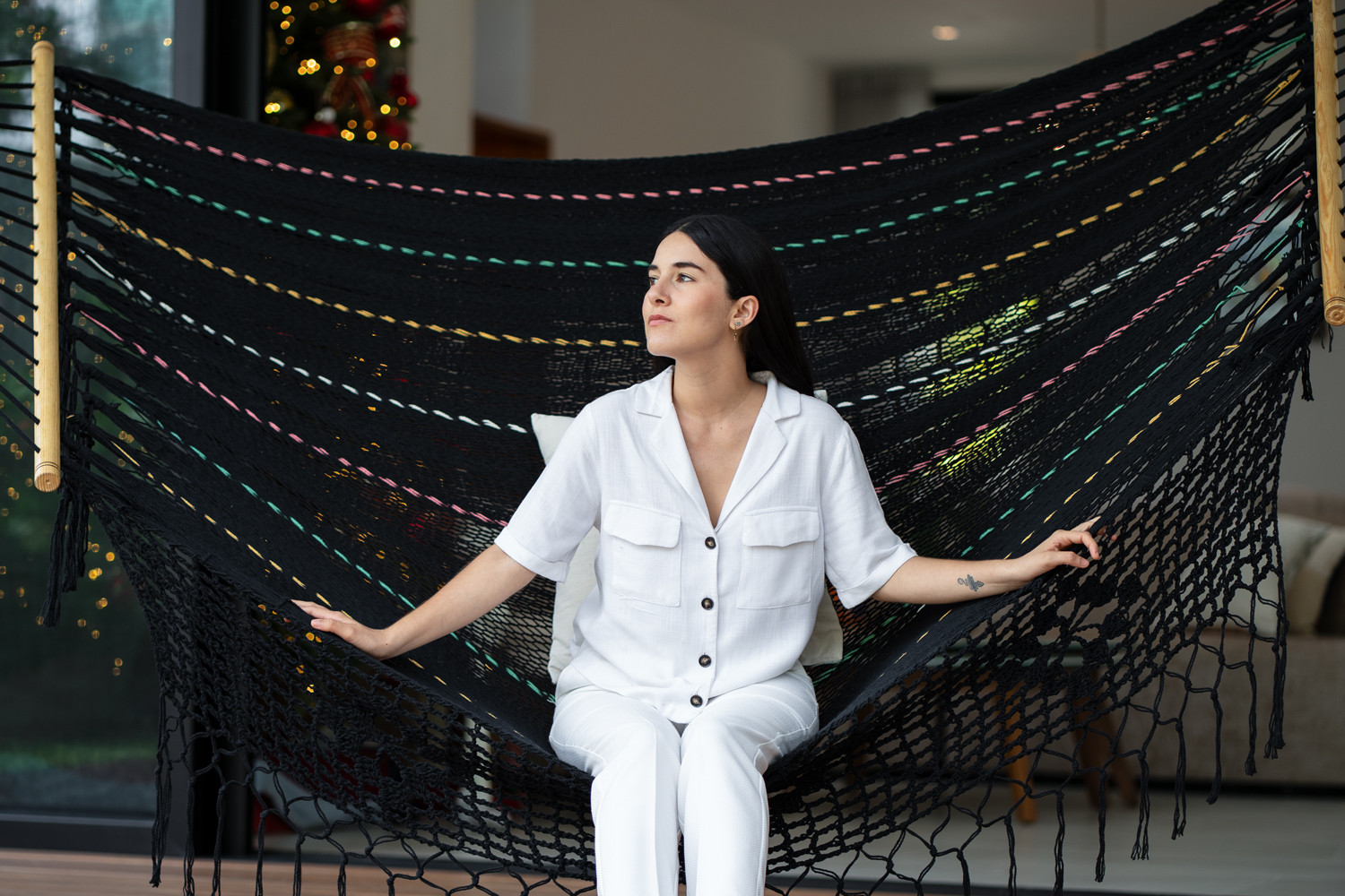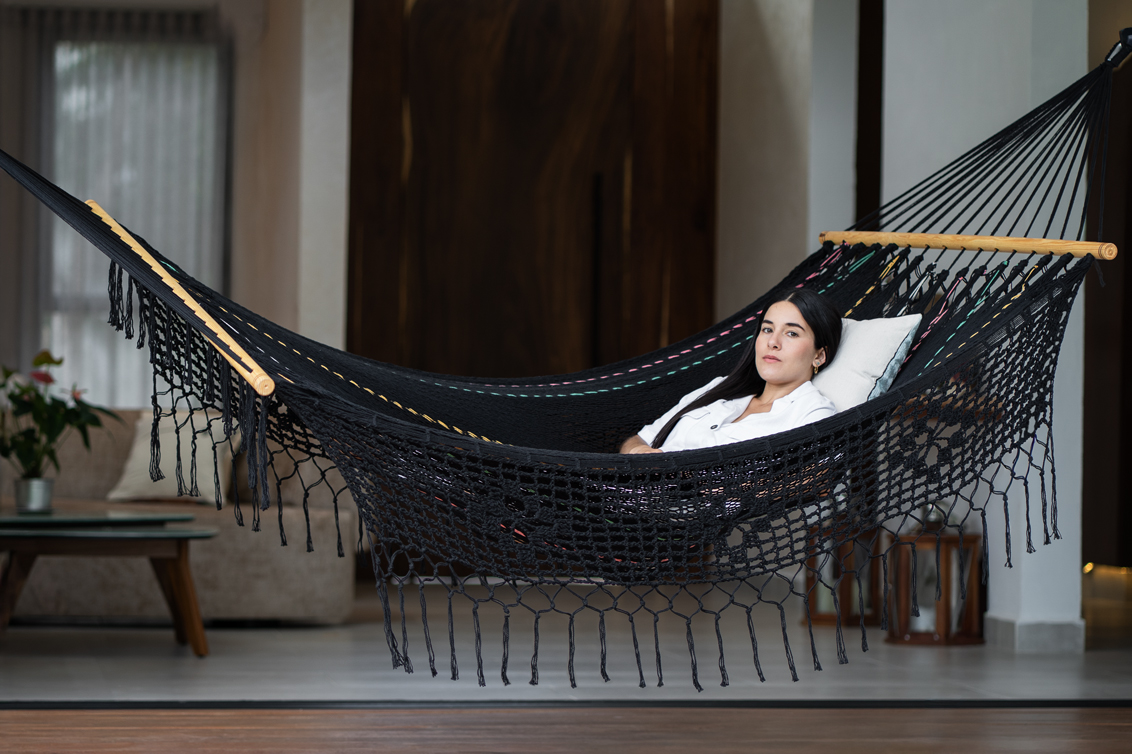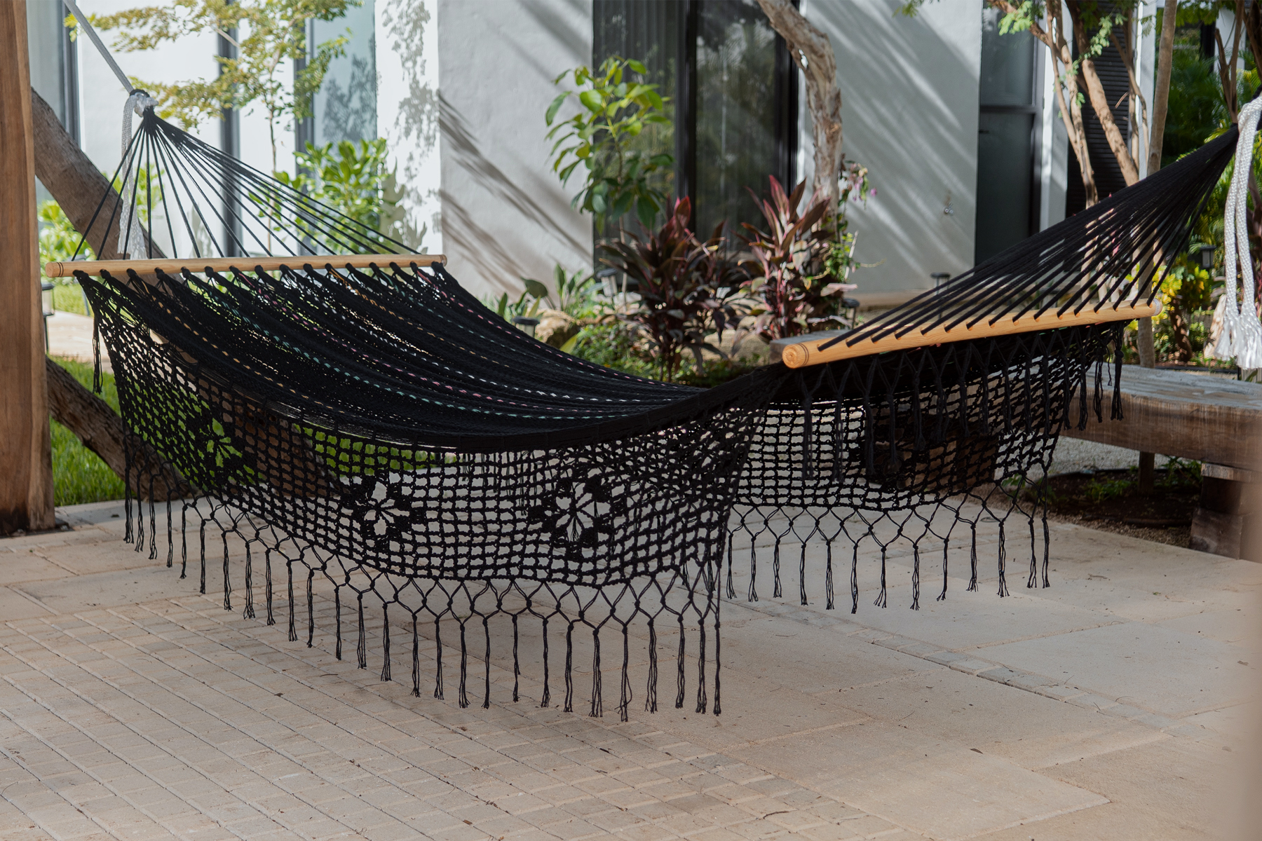 Inspirada en la leyenda maya de X-Box “La Negra”, esta hamaca artesanal encarna misterio y sofisticación, evocando la elegancia ancestral de los pueblos mayas.
