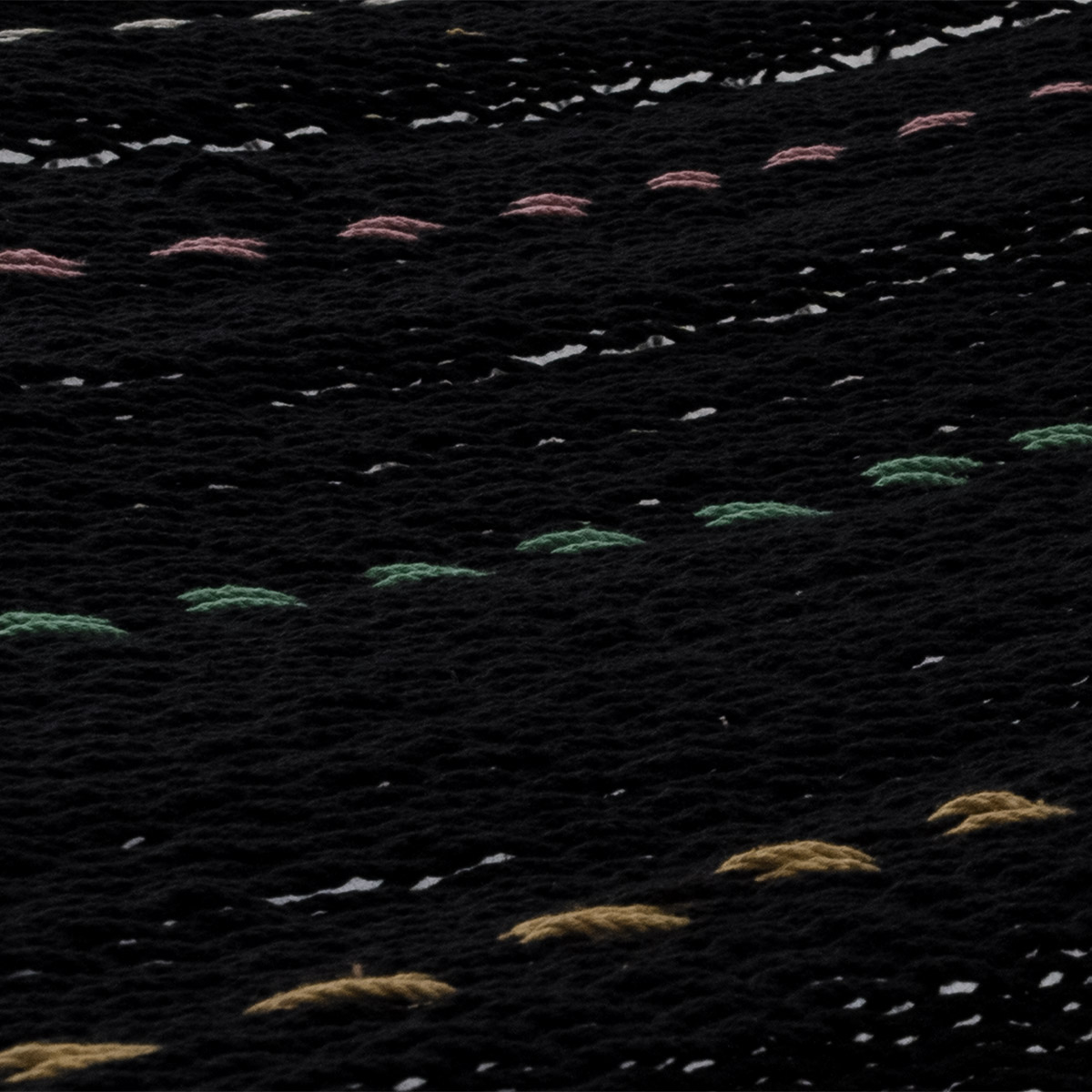 Su base en negro profundo contrasta con cintas en amarillo, verde, salmón y beige, creando un equilibrio perfecto entre misterio y calidez.