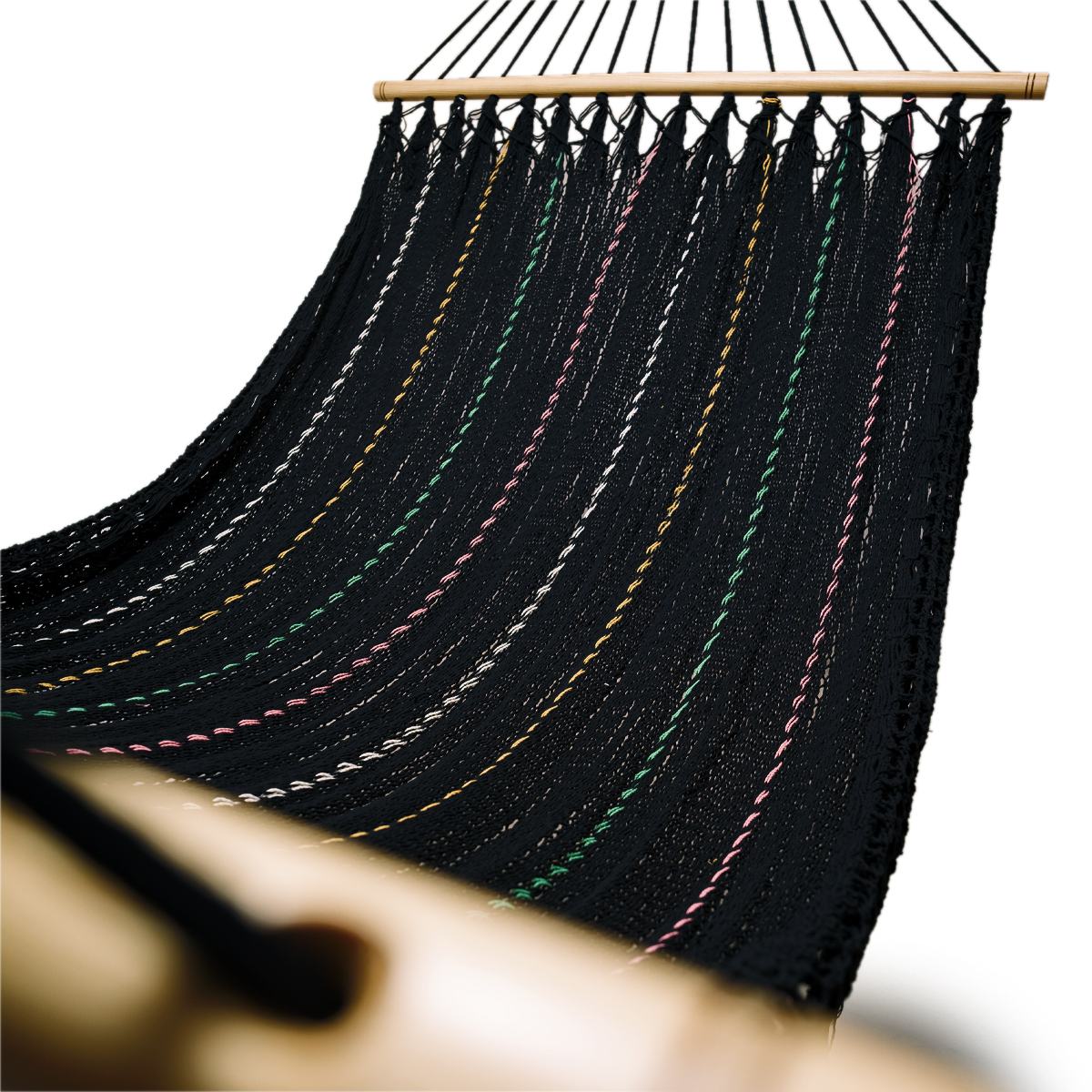 Hamaca sujeta por los extremos a un par de maderas de Pino, que sumado a los Encajes que cuelgan en los bordes, le proporciona elegancia y majestuosidad.