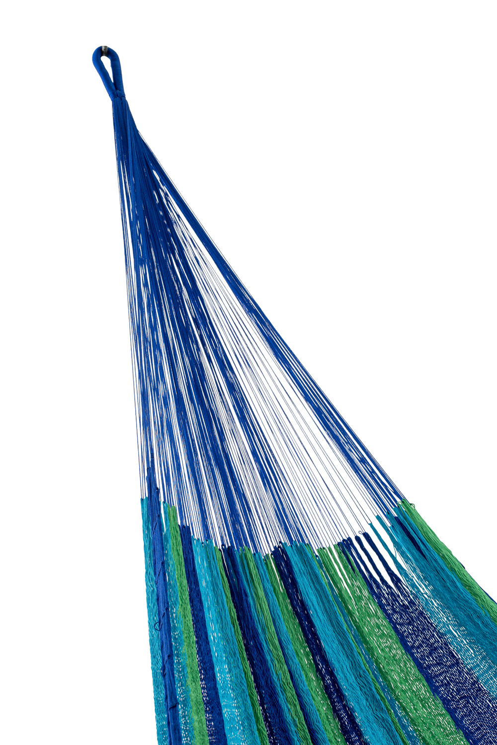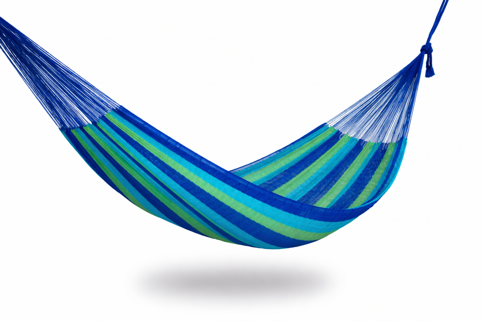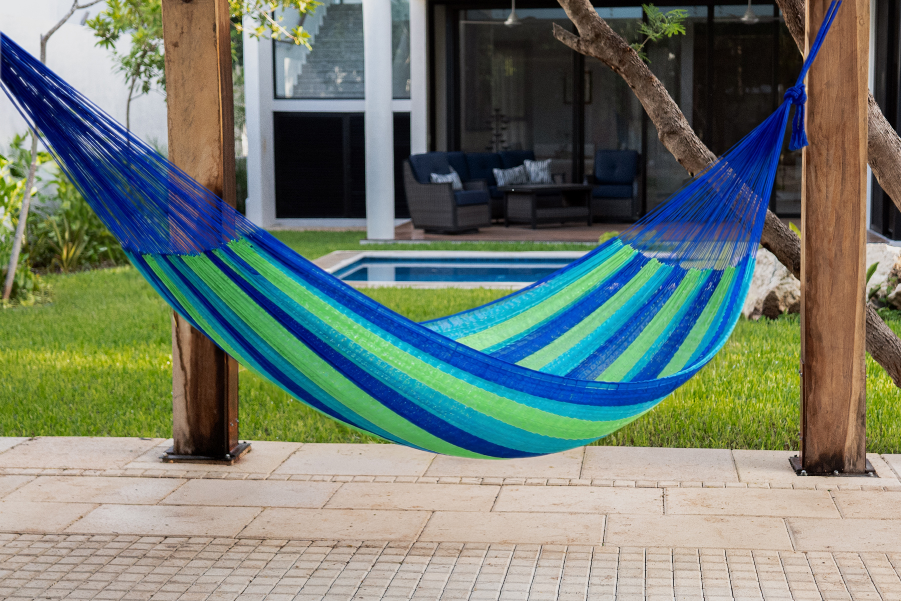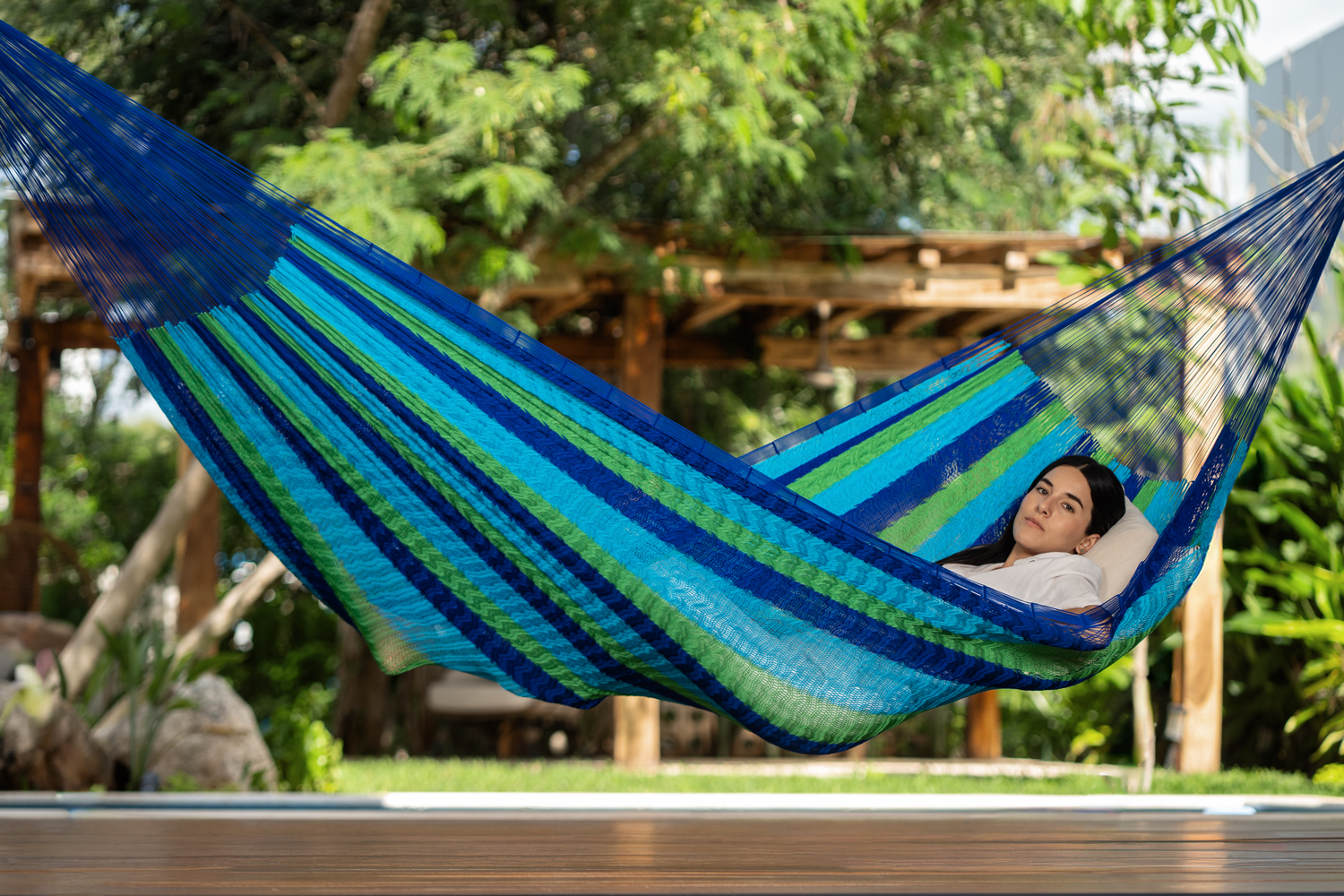 Disfruta de momentos de descanso y frescura con la hamaca EXTERIA OCEÁNICA, tejida 100% a mano en Super Nylon por artesanas mayas de la península de Yucatán. Confortable y resistente, ofrece versatilidad y comodidad, ideal para descansar y disfrutar de tus momentos de relax en cualquier espacio.