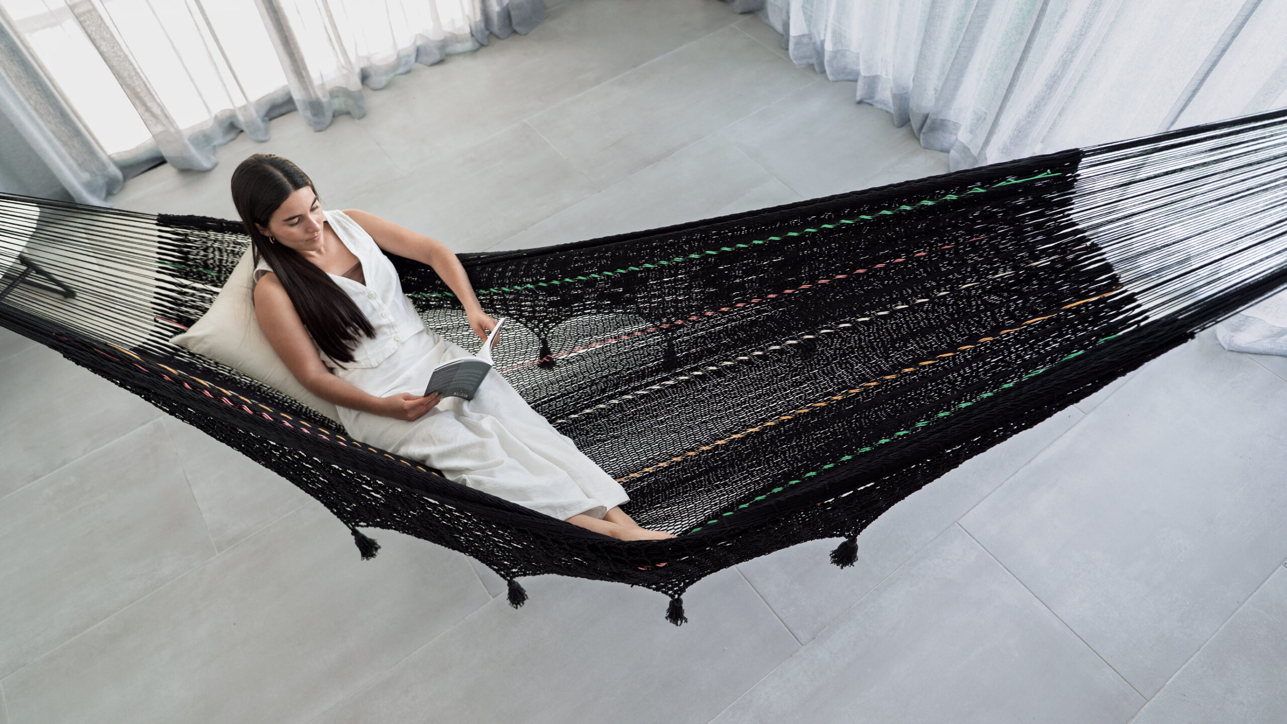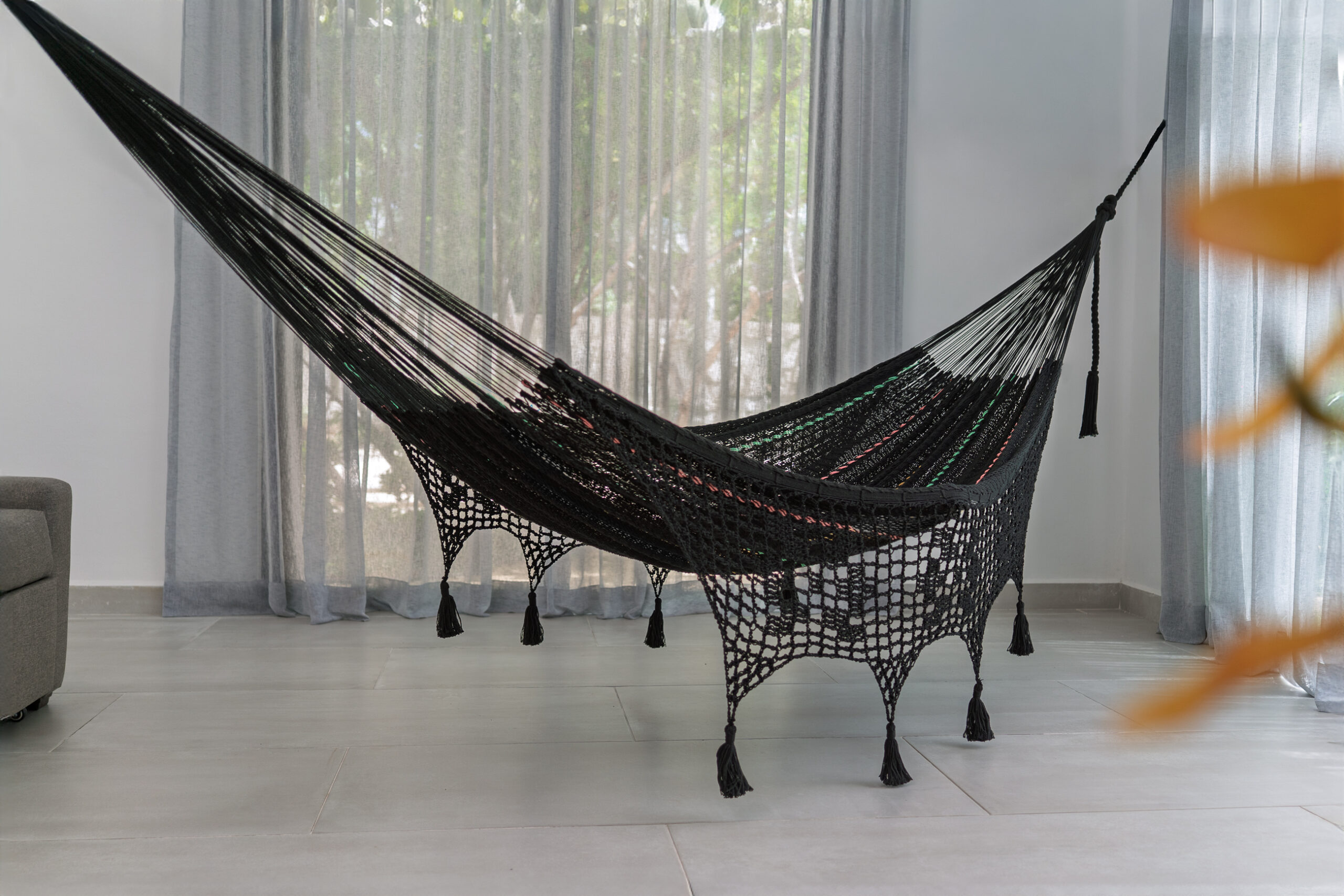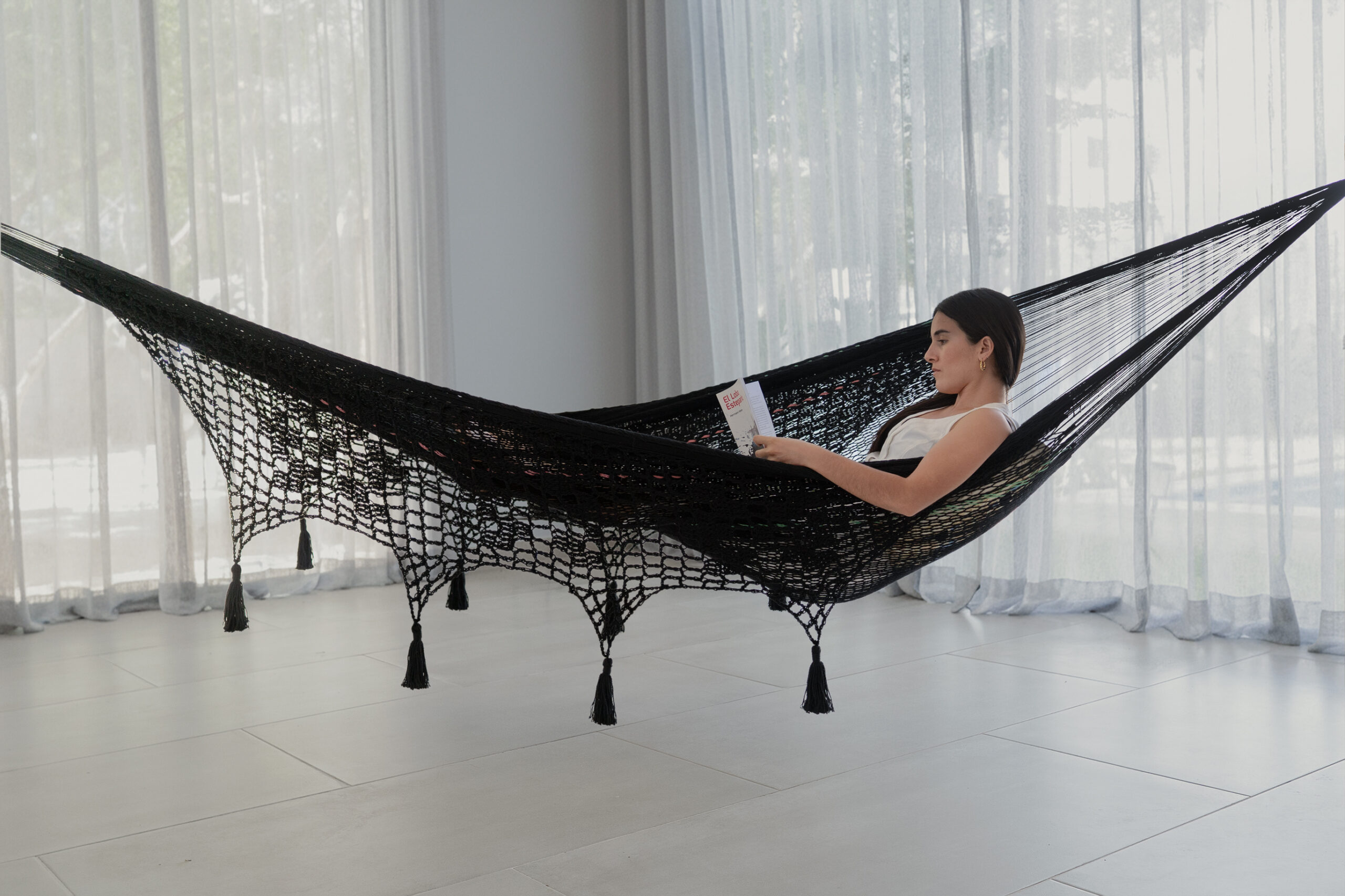 Disfruta de momentos de confort y elegancia con la hamaca TERRAZA BOOX, tejida 100% a mano en algodón por artesanas mayas de la península de Yucatán. Cómoda y sofisticada, sus finos encajes aportan estilo y personalidad, perfecta para relajarse en terrazas y balcones con encanto y carácter.