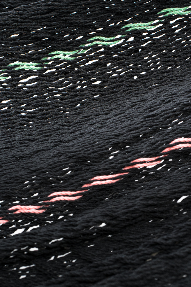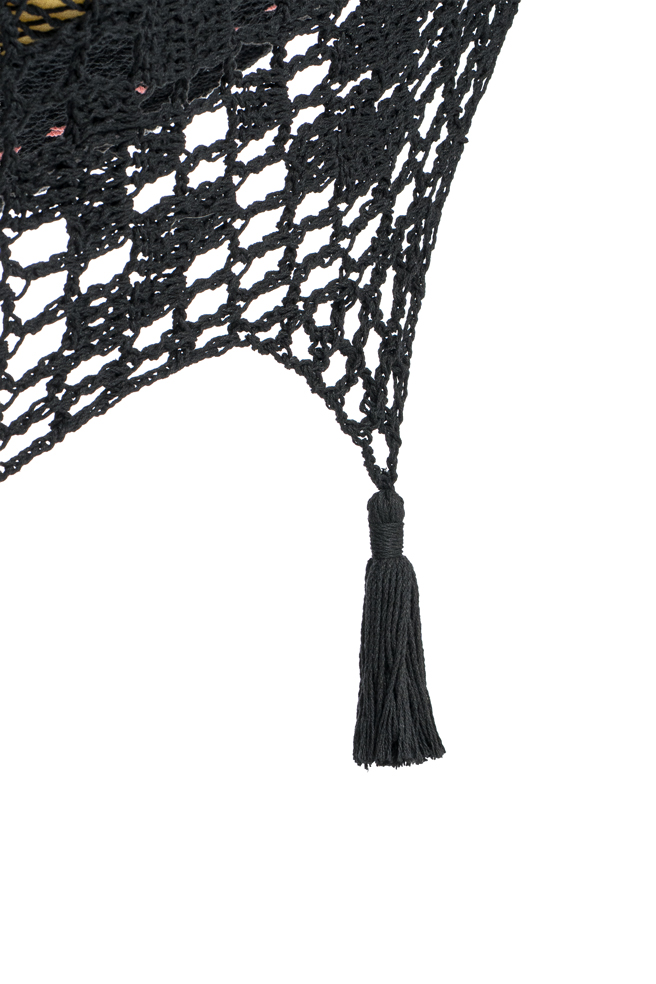 - Color: Negra con cintas en tonos amarillo, verde, salmón y beige