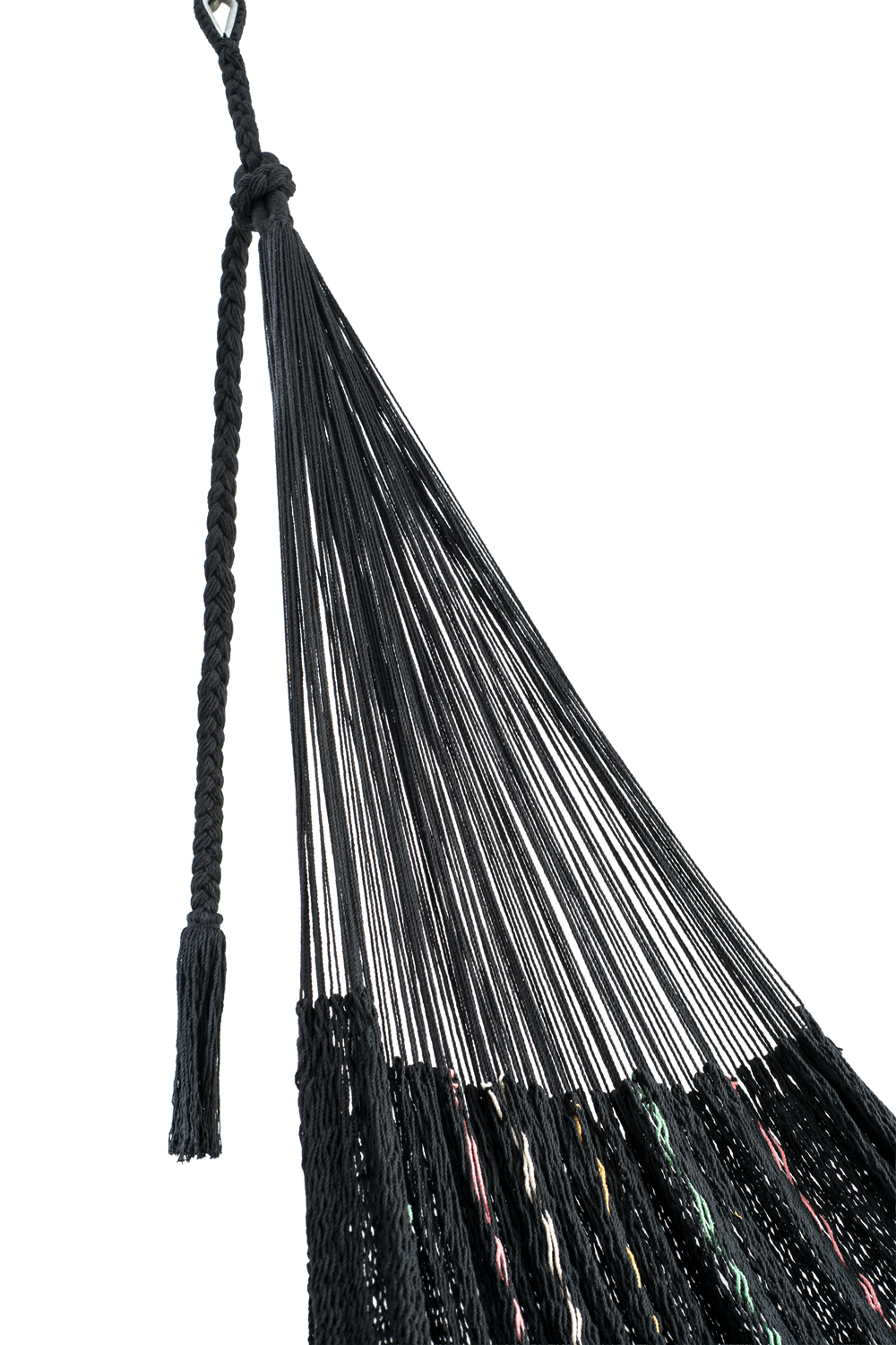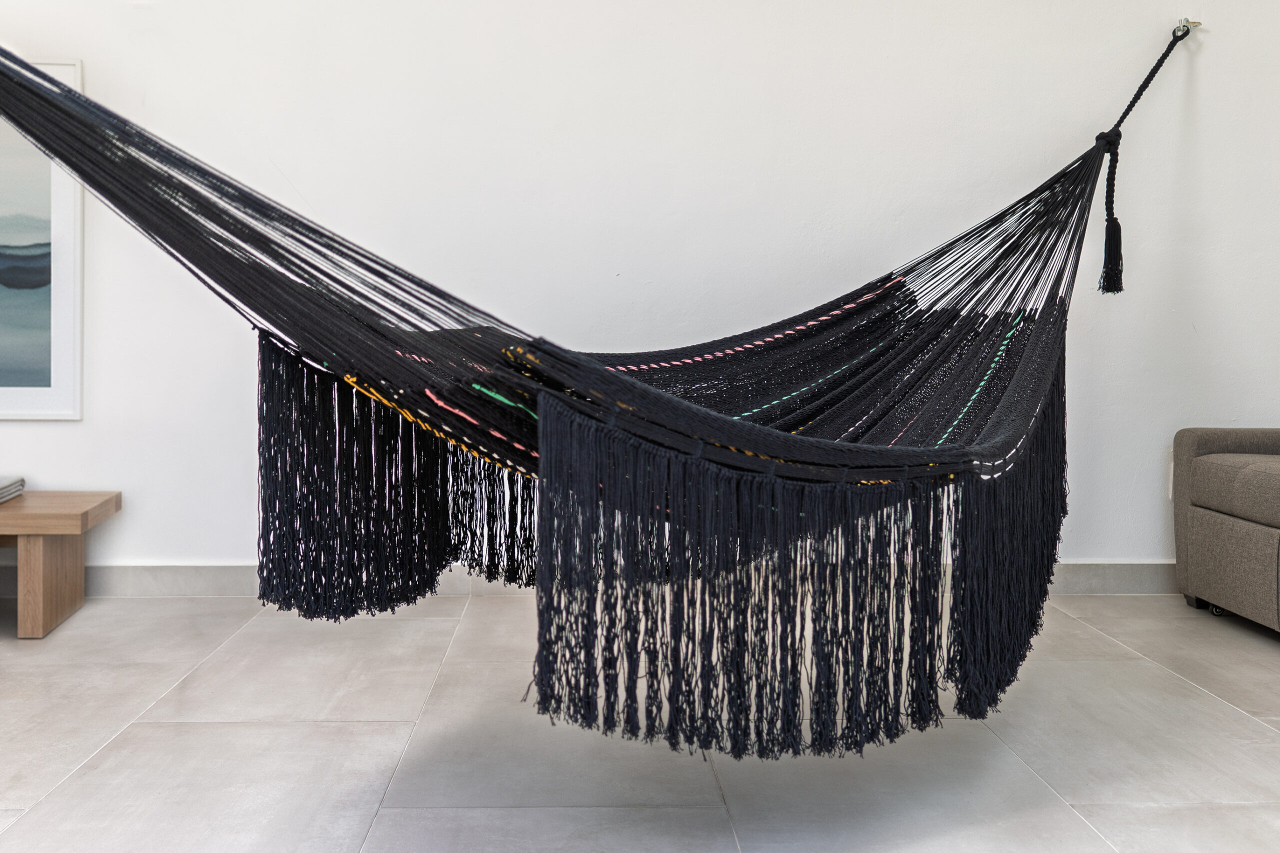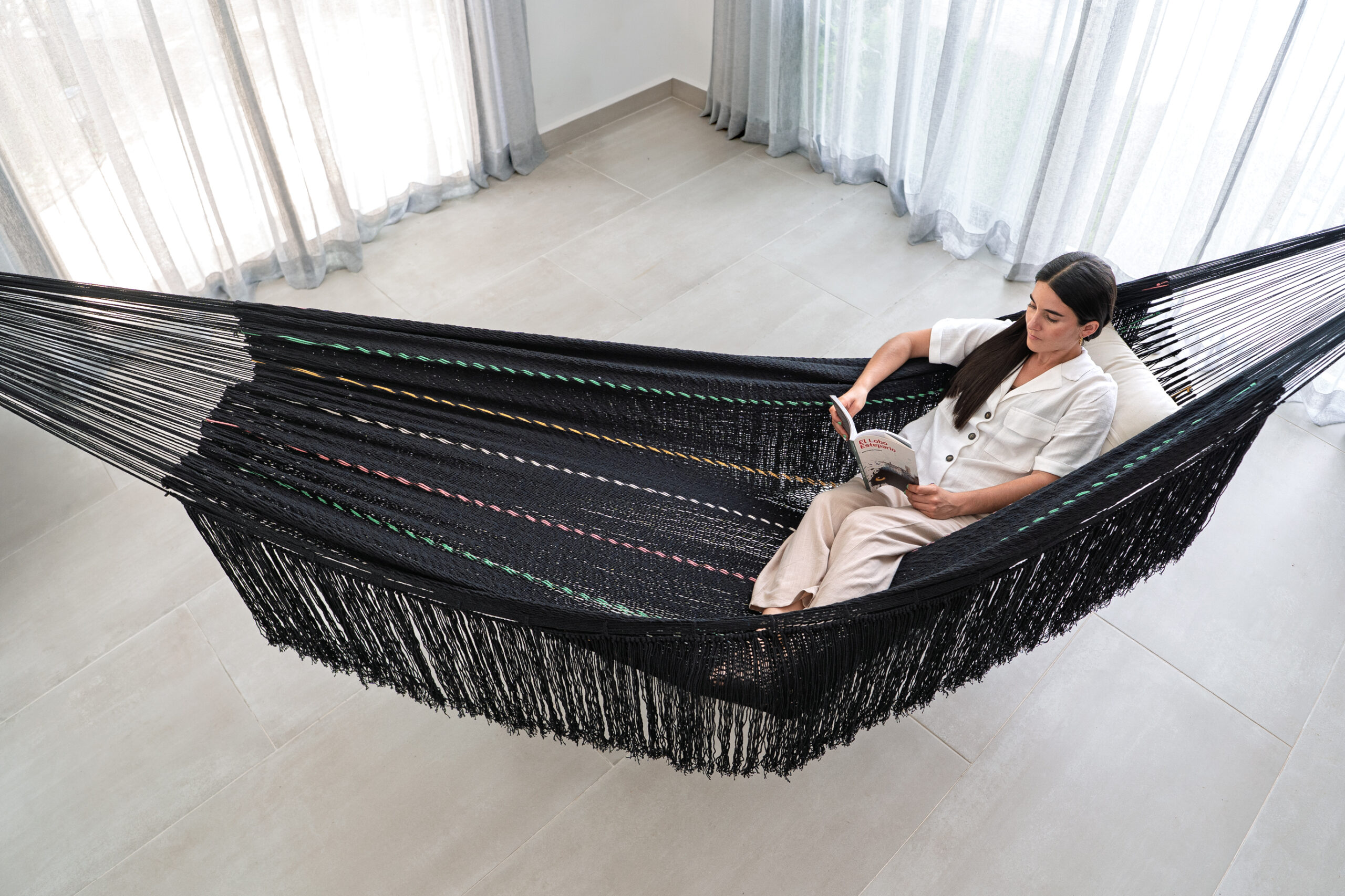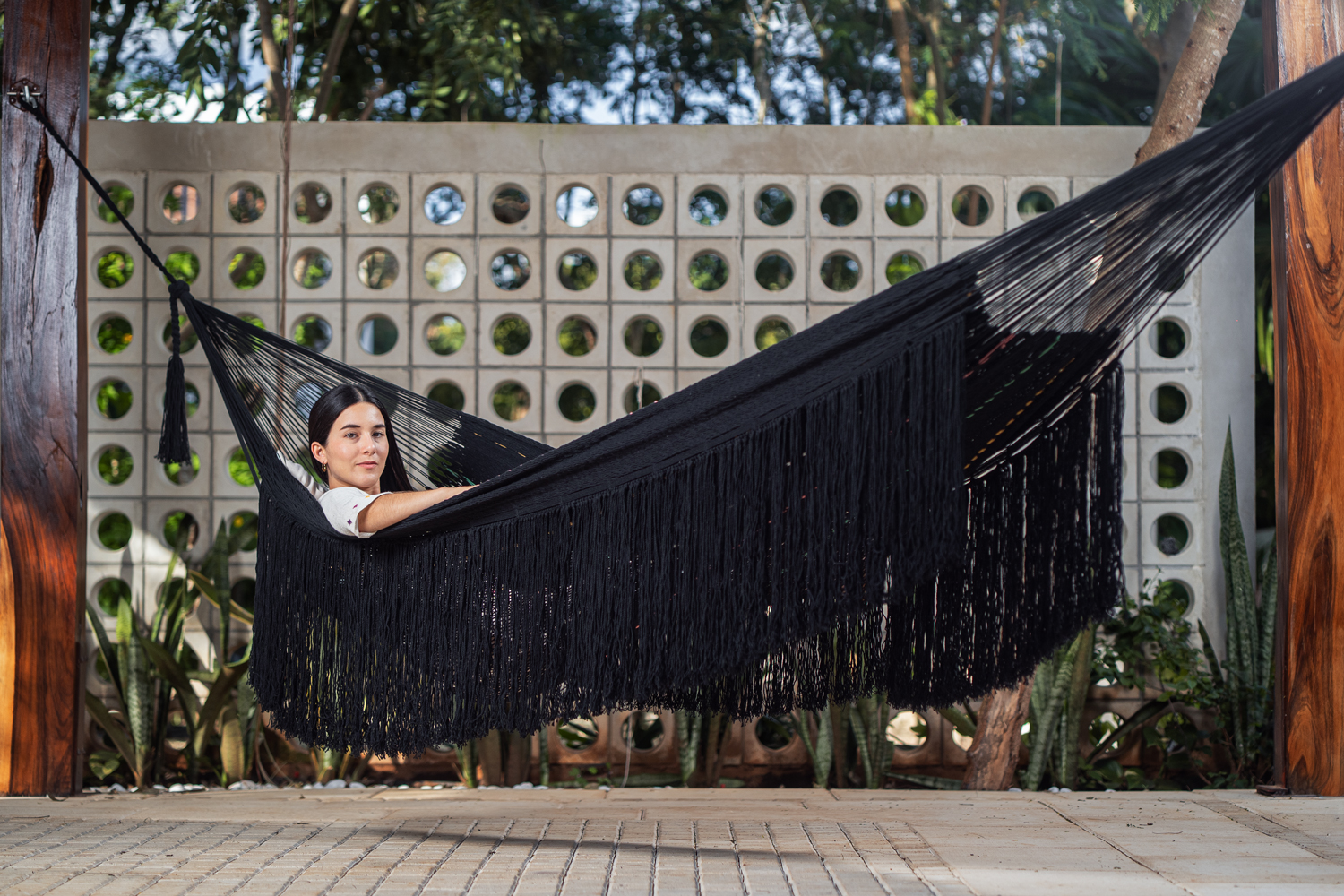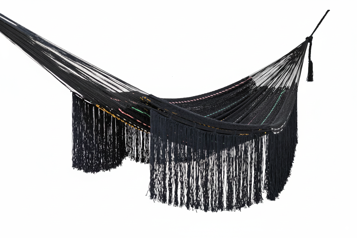 Inspirada en la leyenda maya de X-Box “La Negra”, esta hamaca artesanal encarna misterio y sofisticación, evocando la elegancia ancestral de los pueblos mayas.
