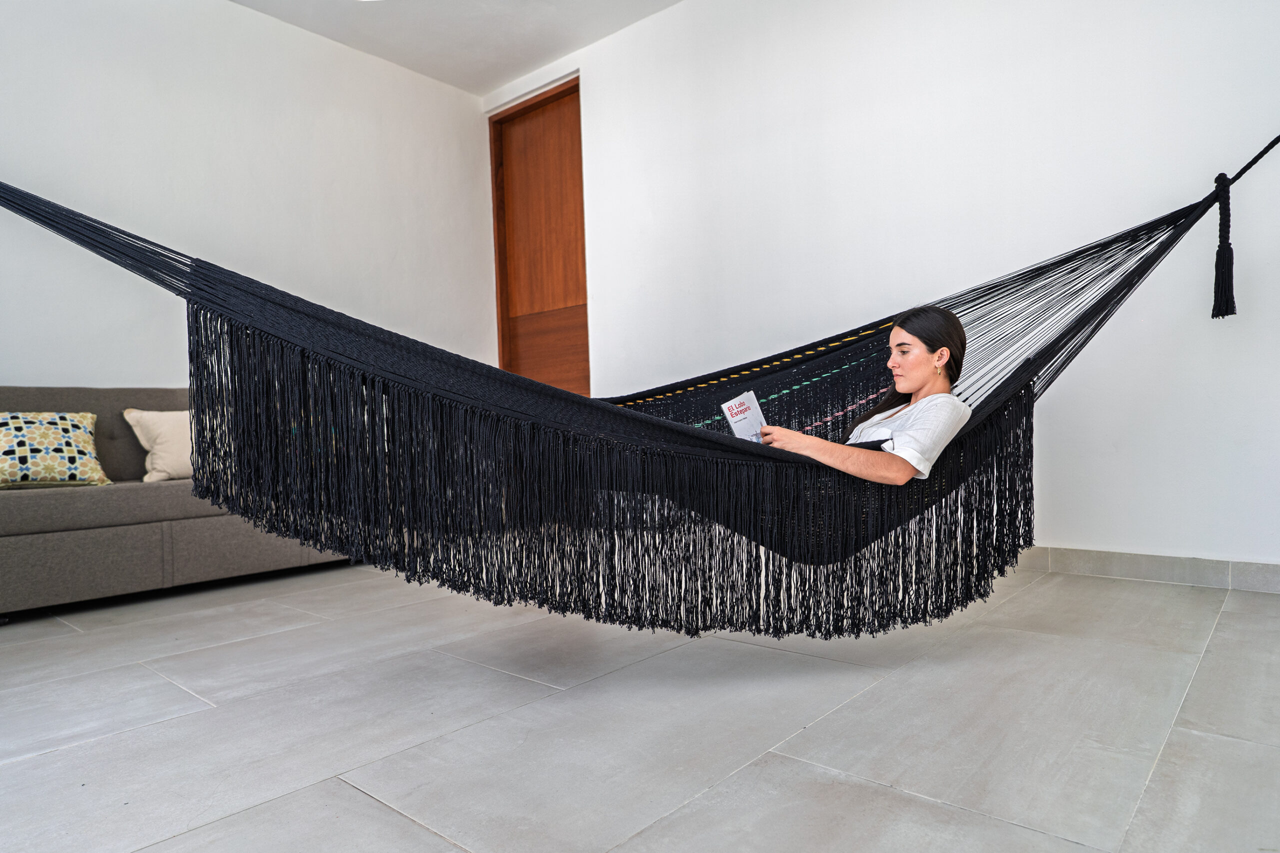 Disfruta de momentos de calma y encanto con la hamaca XTABAY BOOX, tejida 100% a mano en algodón por artesanas mayas de la península de Yucatán. Encantadora y sofisticada, sus delicados flecos, inspirados en la leyenda de Xtabay, aportan un toque ancestral y tradicional, perfecta para interiorismo y para crear ambientes únicos que invitan al descanso y la relajación.