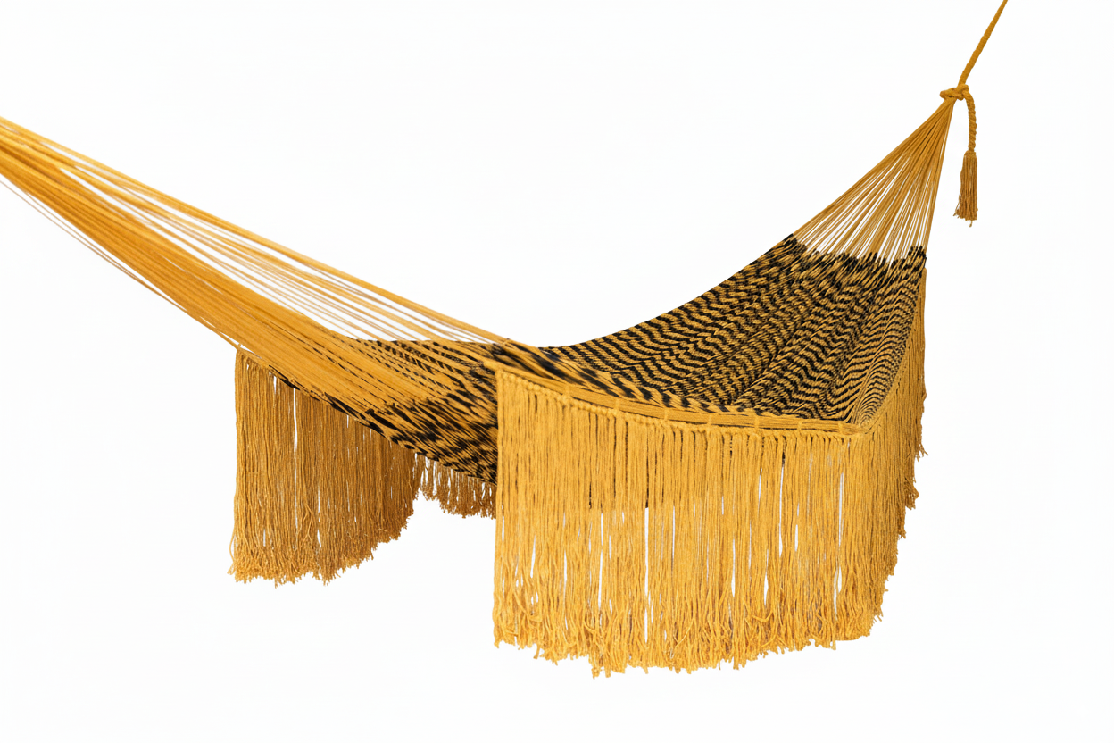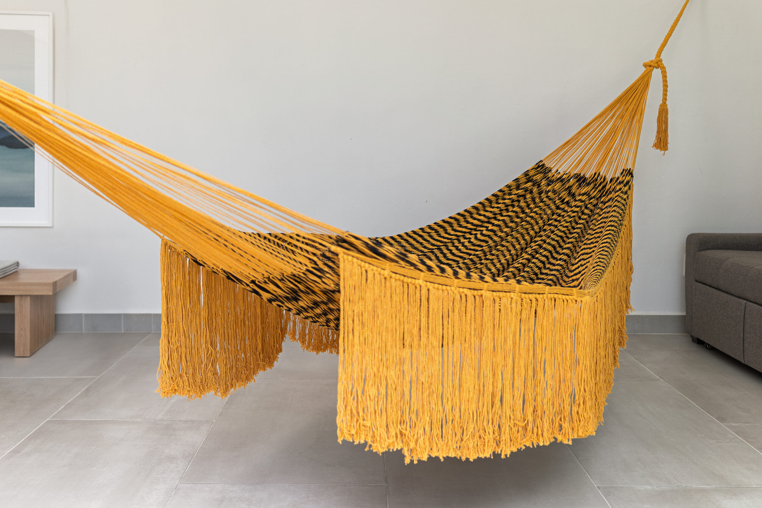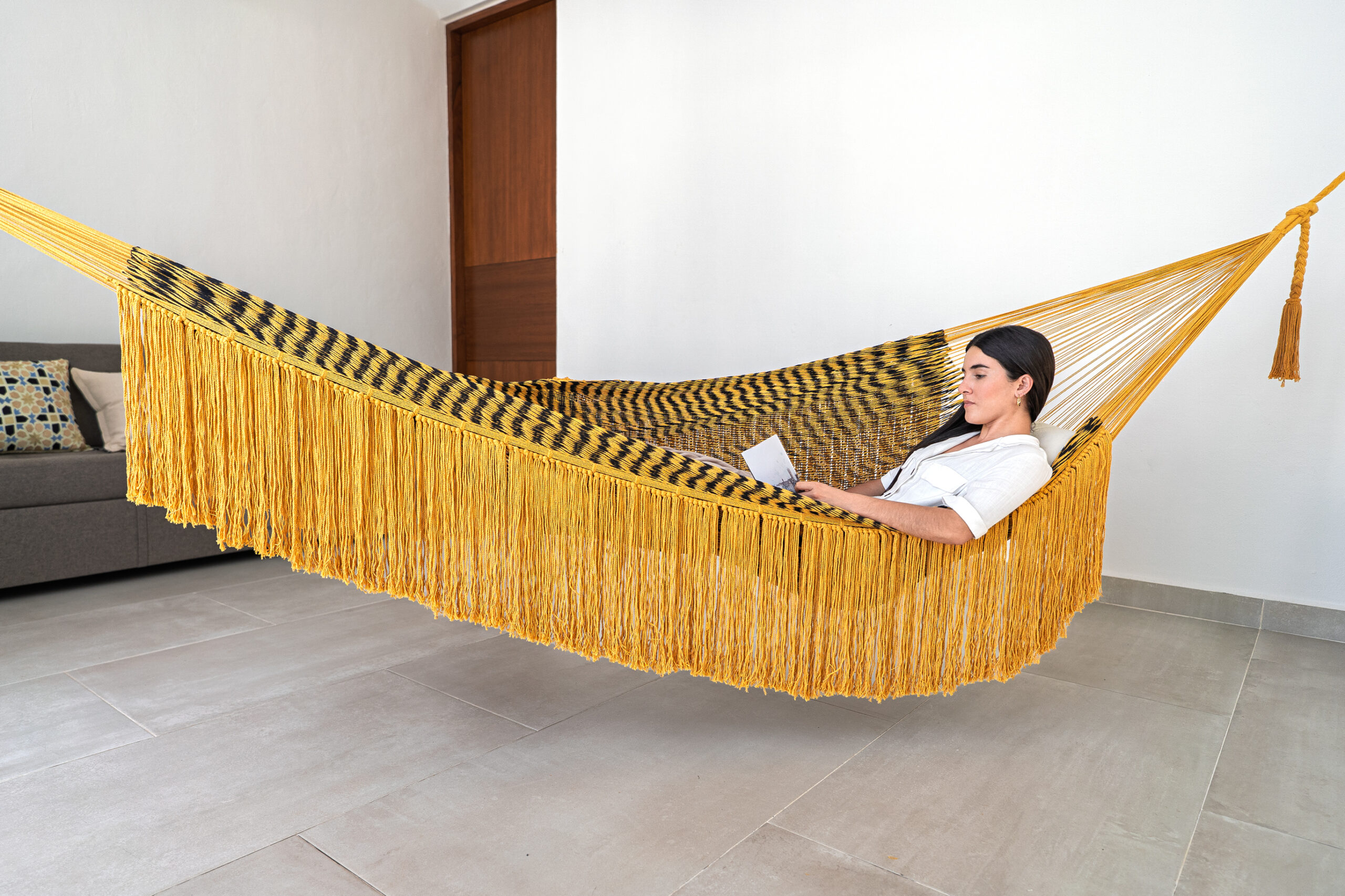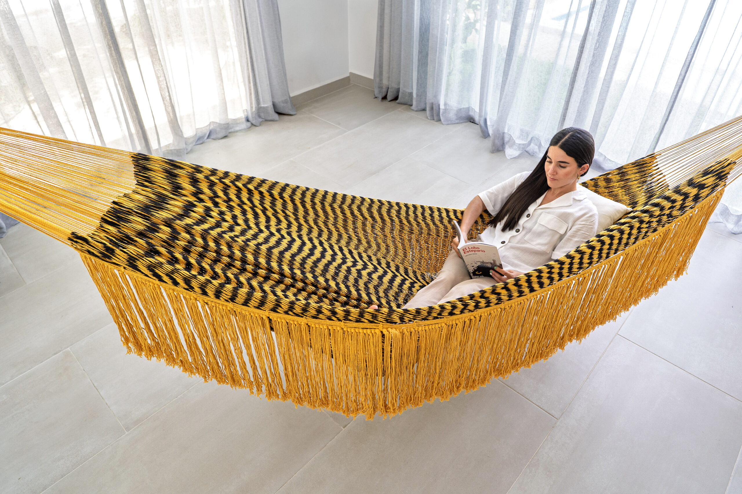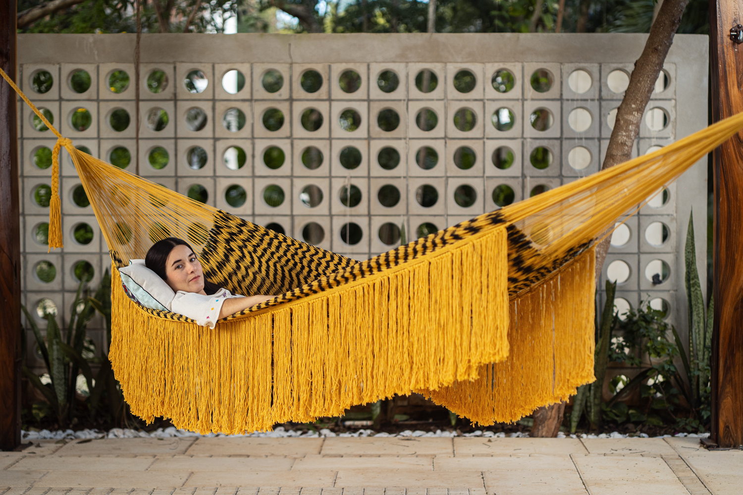 Disfruta de momentos de calma y encanto con la hamaca XTABAY MAMBA, tejida 100% a mano en algodón por artesanas mayas de la península de Yucatán. Encantadora y sofisticada, sus delicados flecos, inspirados en la leyenda de Xtabay, aportan un toque ancestral y tradicional, perfecta para interiorismo y para crear ambientes únicos que invitan al descanso y la relajación.